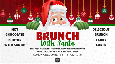 Bring the whole family and celebrate the season at our Brunch with Santa event!Enjoy brunch specials, enjoy delicious hot chocolate and candy canes, and Santa will be here for photos!Receive one free kids meal with the purchase of an adult brunch entree. Limit one kids meal per adult entree.And while you're here, take advantage of our 12 days of Christmas specials! Our 12 Days Of Christmas Special on Sunday, December 14th is receive two $10 vouchers for every $50 gift card that you purchase!We can't wait to see you!